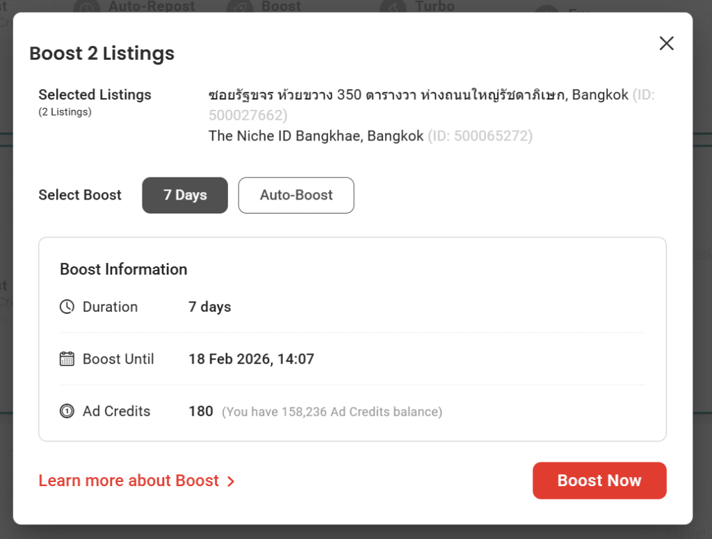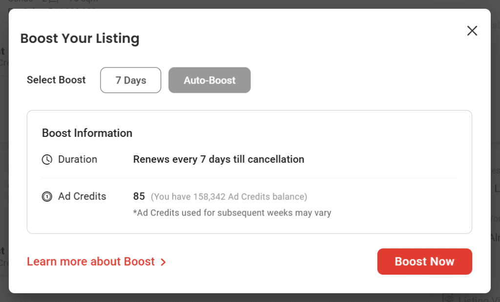 Make sure to check your 1) Selected Listings 2) Boost Information and 3) Total Ad Credits required to Boost on selected listings from this pop-up.