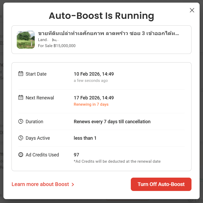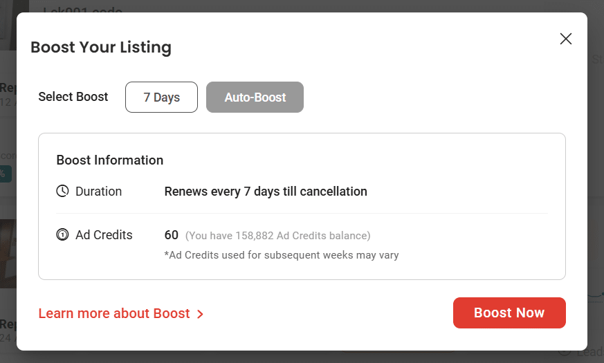 Your listing will then be automatically re-Boosted, and Ad Credits will be deducted 7 days after the listing’s first Boost.